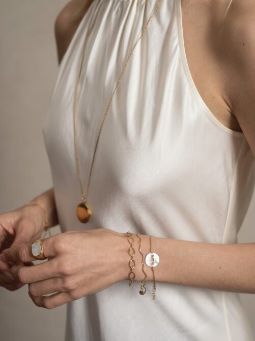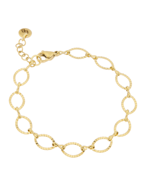 Armband met bewerkte ovale schakel. Goudplating op een longlasting stainless steel. Voorzien van een verlengkettinkje waardoor de armband altijd past.