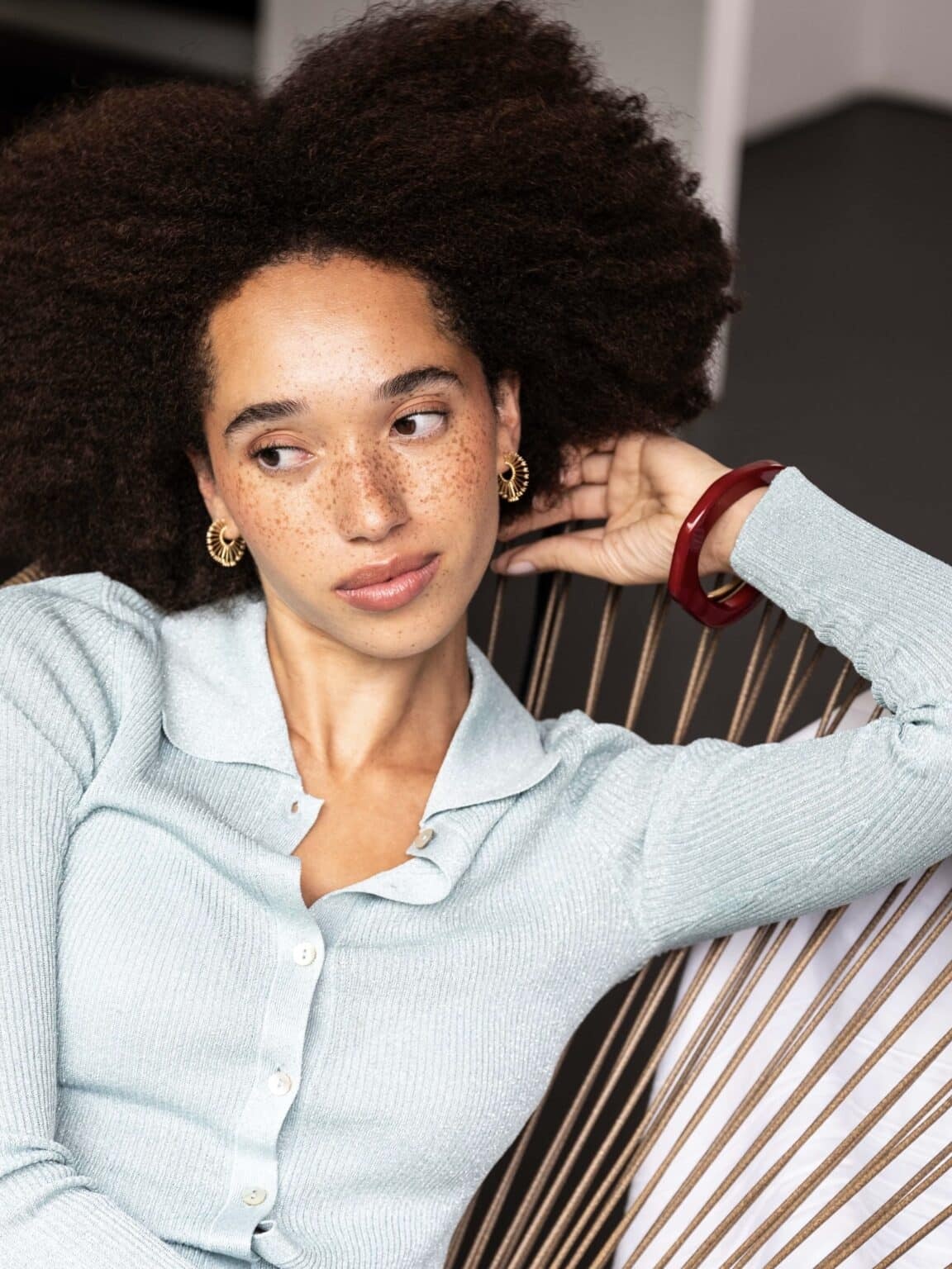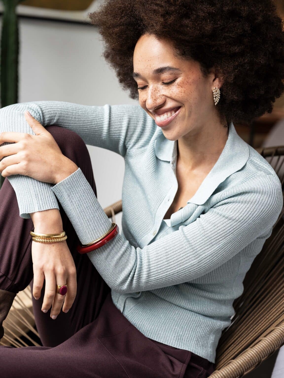 Bangle gemaakt van gelakte hars in een platte organische vorm in diepe bordeaux rode kleur. De inner diameter van de bangle is 7cm en de dikte is 9mm.