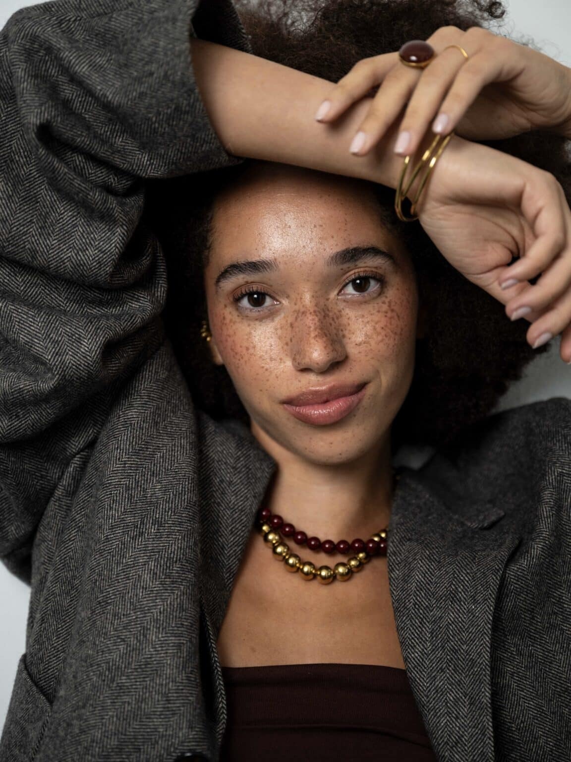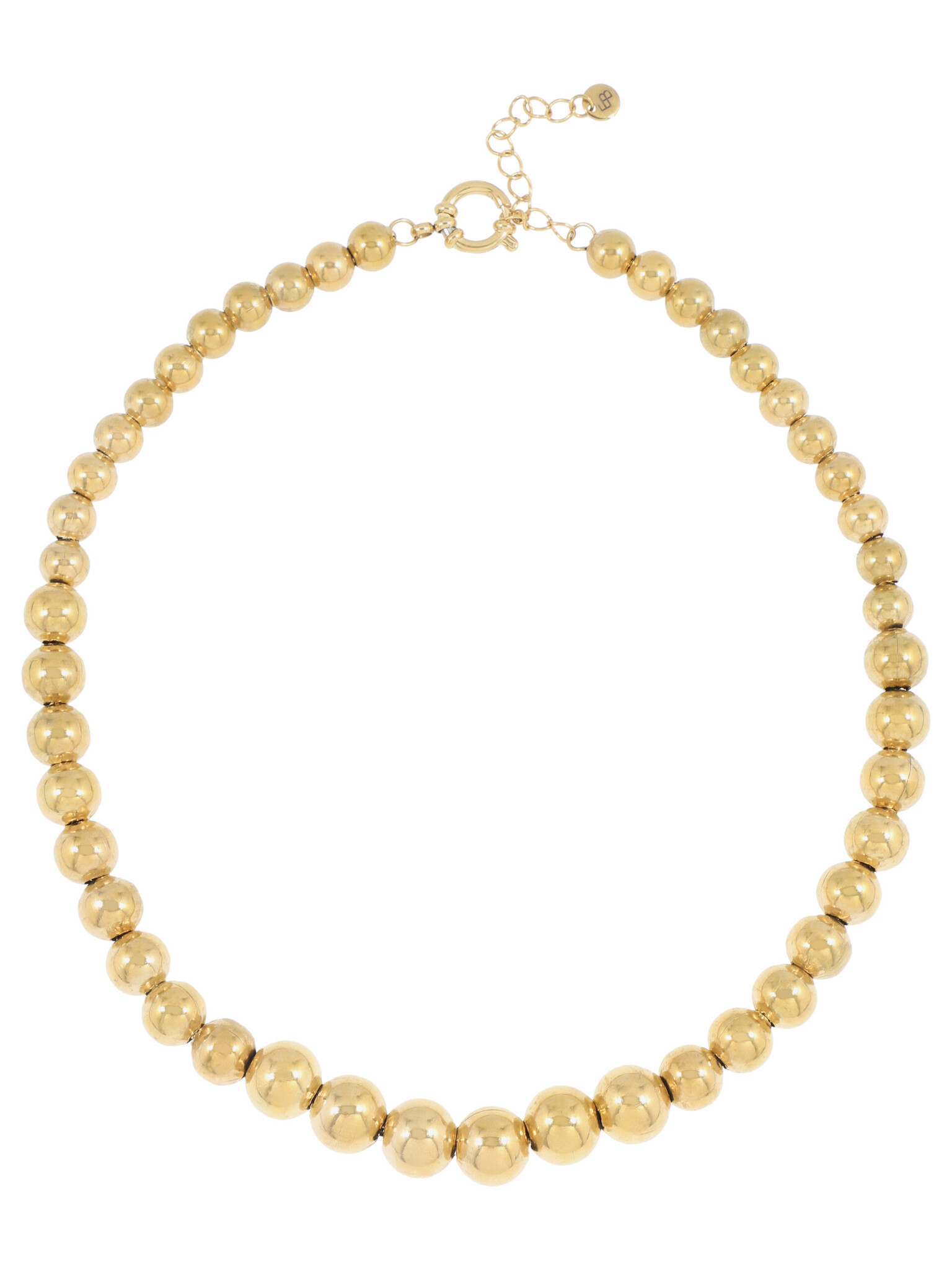 Korte elegante ketting met gouden ballen. De diameters van de gemstones variëren van 7 tot 12 mm. Lengte van de ketting is 16 inch (40 cm) met een verlengkettinkje van 5 cm, zodat je de pasvorm makkelijk aan kunt passen. Verguld op long-lasting stainless steel.