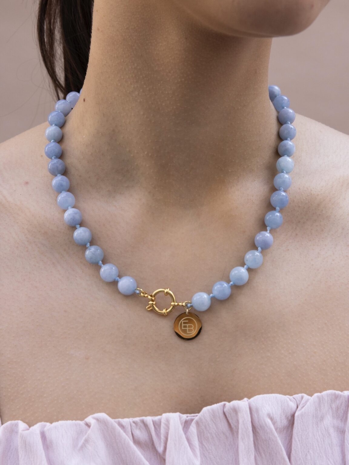 Geef je look een frisse en verfijnde uitstraling met deze prachtige gemstone ketting in een blauwe tint. De ketting is zorgvuldig ontworpen met prachtige gemstones. Met een lengte van 16 inch (40 cm) valt de ketting mooi rond de halslijn. De ronde gemstones hebben een diameter van 1.2cm. De gouden accenten zijn verguld op longlasting stainless steel.