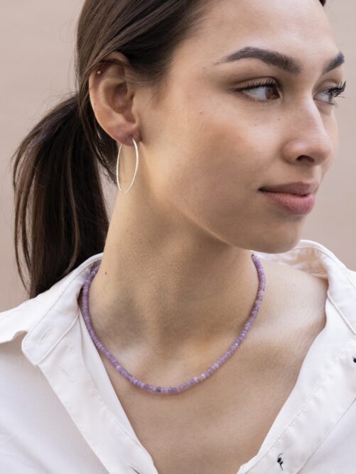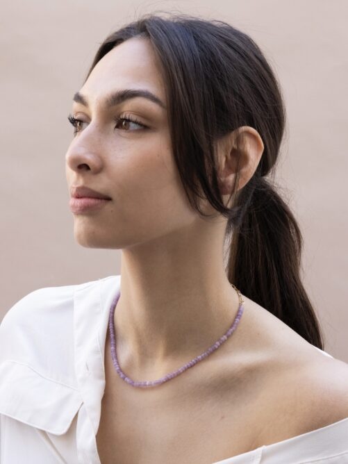 Voeg een speelse touch toe aan je look met dit frisse lila gemstone kettinkje. Elke steentje is facetgeslepen. De ketting heeft een lengte van 16 inch en is voorzien van een verlengkettinkje met ovale schakel, zodat je de pasvorm eenvoudig kunt aanpassen.