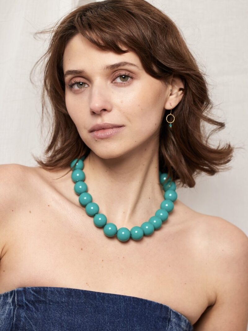 Korte opvallende ketting met grote ronde kralen van gelakte hars in petrol blauw. De ketting is afgewerkt met een rond slot en de kralen hebben een diameter van 2cm. De lengte van de ketting 18inch (45cm). Raadpleeg onze size guide om te zien hoe de ketting valt. Een speels en stijlvol statement-item. Verguld op long-lasting stainless steel.