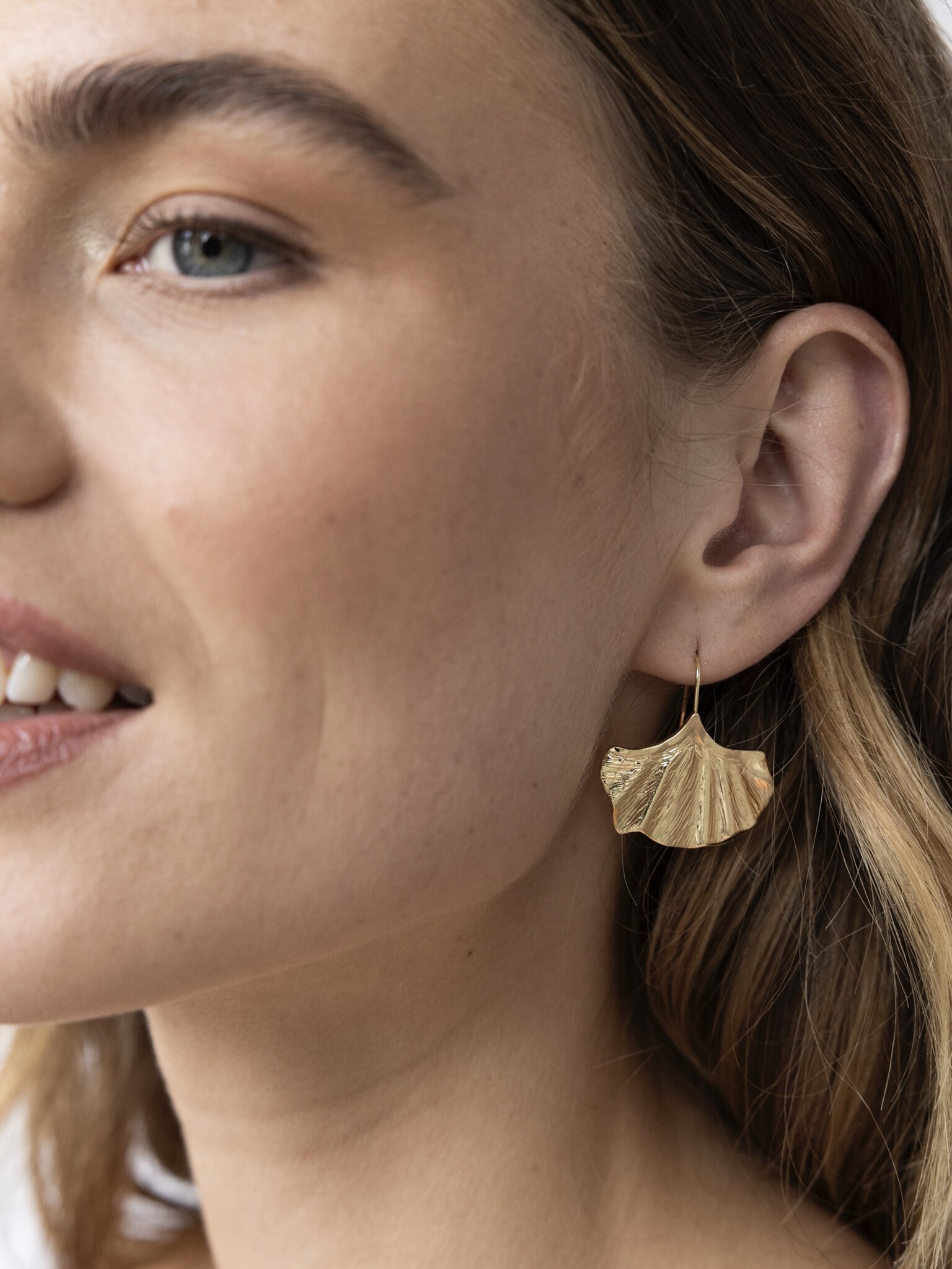 Het ontwerp van deze oorbellen is geïnspireerd op de unieke bladeren van de Ginkgo-boom, met een elegante vergulde afwerking op long-lasting stainless steel. De oorbellen hebben een lengte van 2.9 cm.